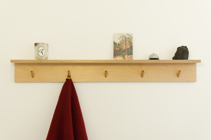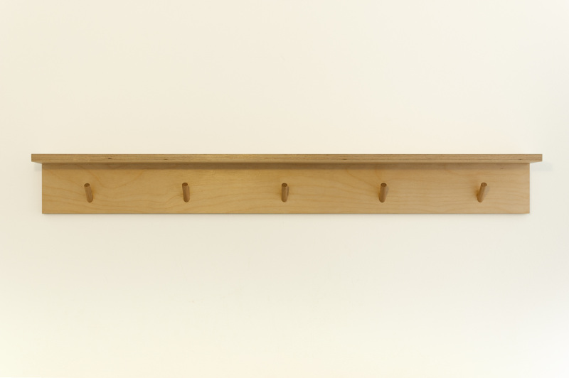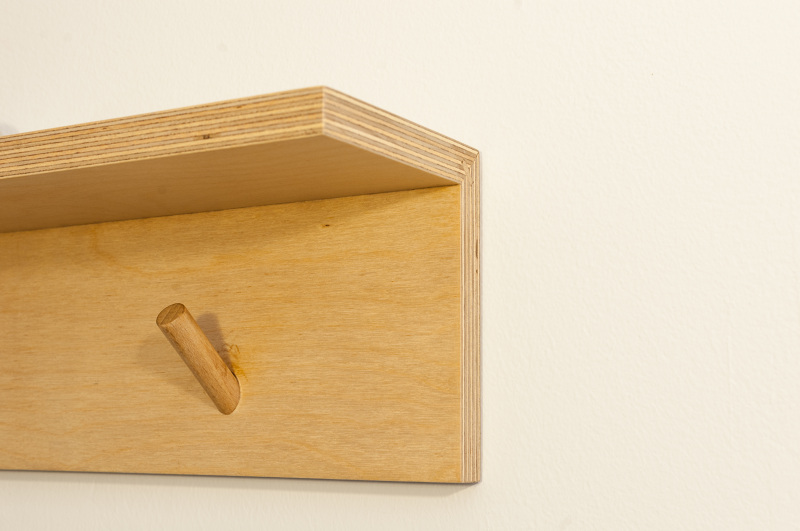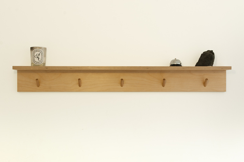 Coat Hanger in birch plywood with beech pegs. Shelf miter joint is reinforced by a spline making it sturdy enough to hold several items. It hangs securely and flush to the wall with two heavy duty z-clips / cleat brackets.