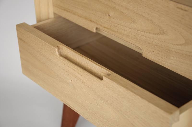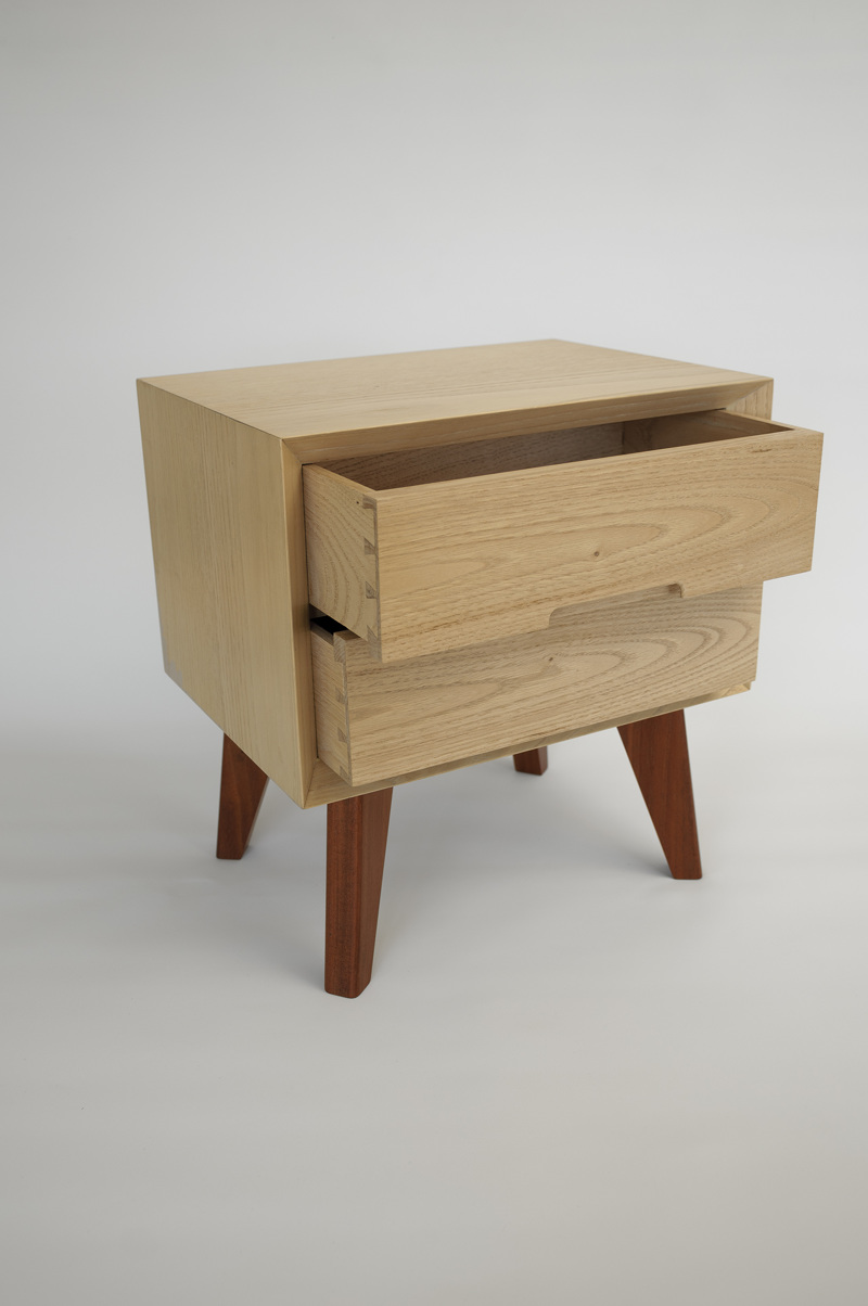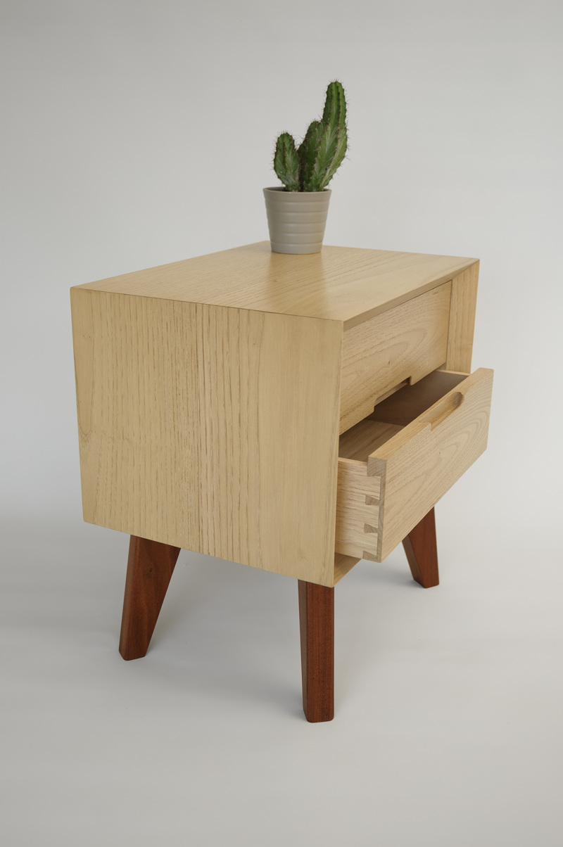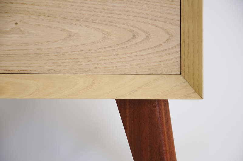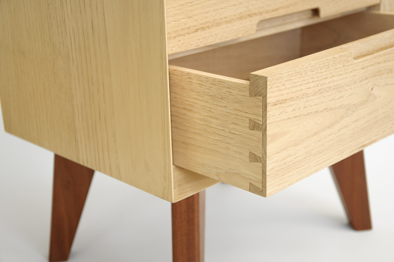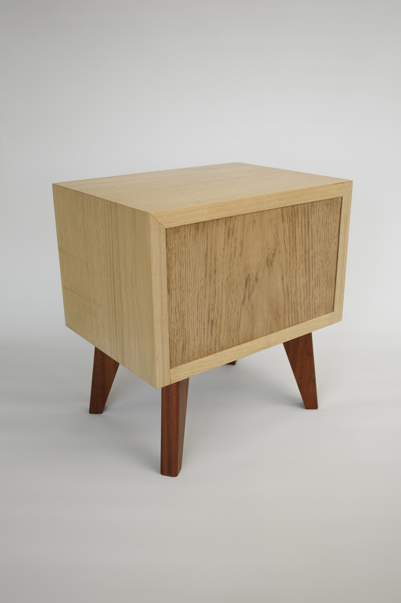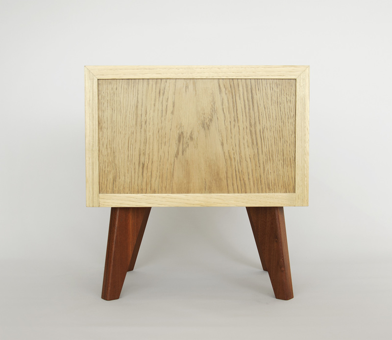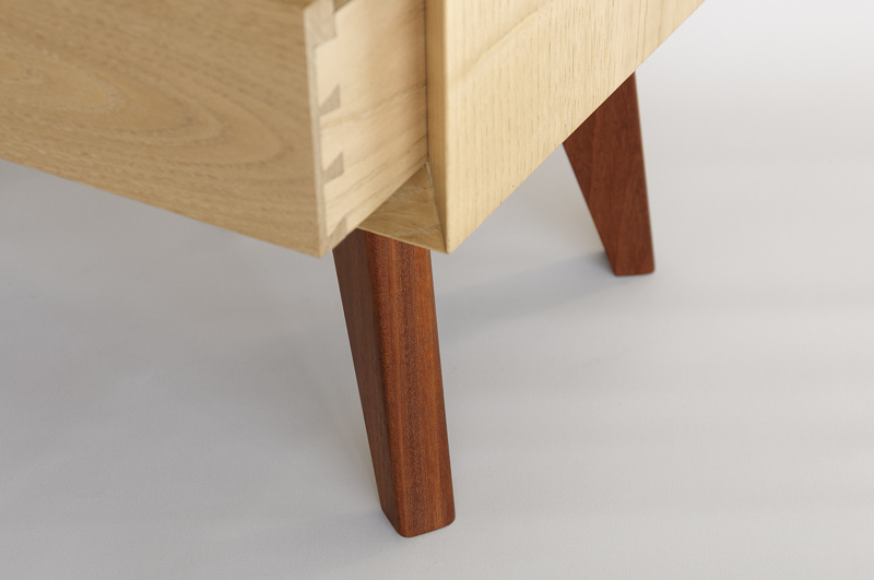 This small container has been built using full-blind dovetail joints which means that all joints are hidden, safe from the ones on the bottom. The front of the panels have been champhered and mitered on the corners. Legs are made of spell wood creating a contrast with the body.