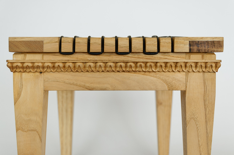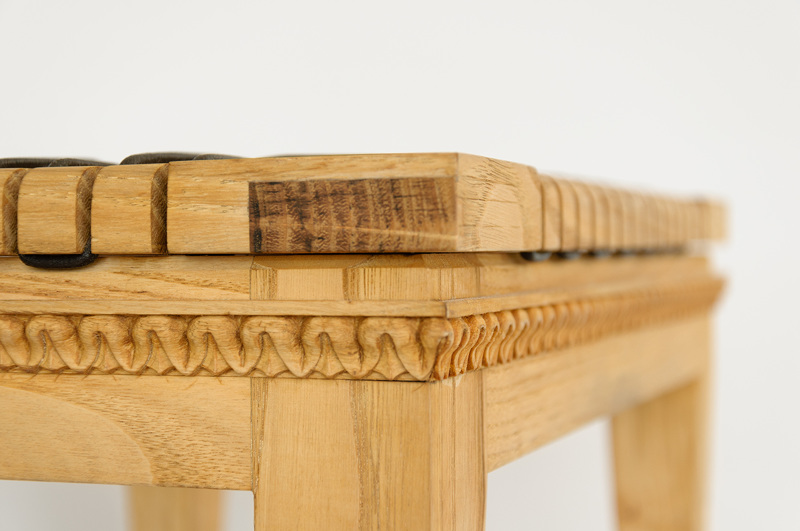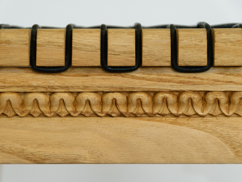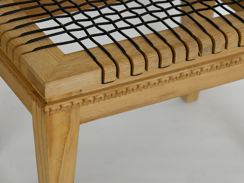 This stool uses traditional mortise and tenon joints. The brim is carved with a classic leaf motif. The top uses black intertwined leather chord.
